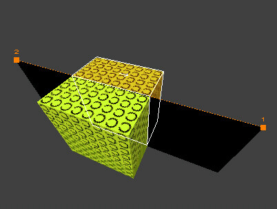 Go back to the 2D view and make sure your brush is still selected. Place your cursor at the XY coordinate 128,0 (to the right of the brush) and do a SHIFT-RightClick. The first orange clipping dot will appear with a small 1 next to it. Then, place your cursor at the XY coordinate -128,0 (to the left of the brush) and do another SHIFT-RightClick. The second orange dot with a 2 next to it will appear and the lower half of your brush will disappear. But the brush is not clipped yet, it's just ready to be clipped at this point. This is what you should get:
