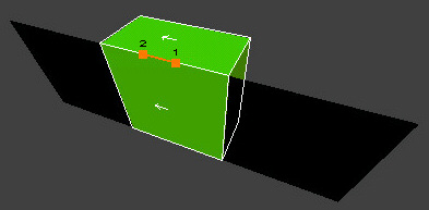 And below is a 3D graphical representation of the clipping plane at work: in this case, a vertical plane since the 2 points were drawn in the XY (top) view. The outlined brush portion is the one that would remain and the other half is the part that would be clipped away if we went ahead with the actual clipping operation. This, I remind you in not exactly what you would see in SinEd's 3D view.