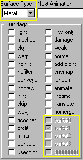 These bits, when set, will set the corresponding grayed out flags in SinEd's surface inspector but more importantly, they will set the Surface Type of your texture as can be seen as outlined in yellow in the image below: